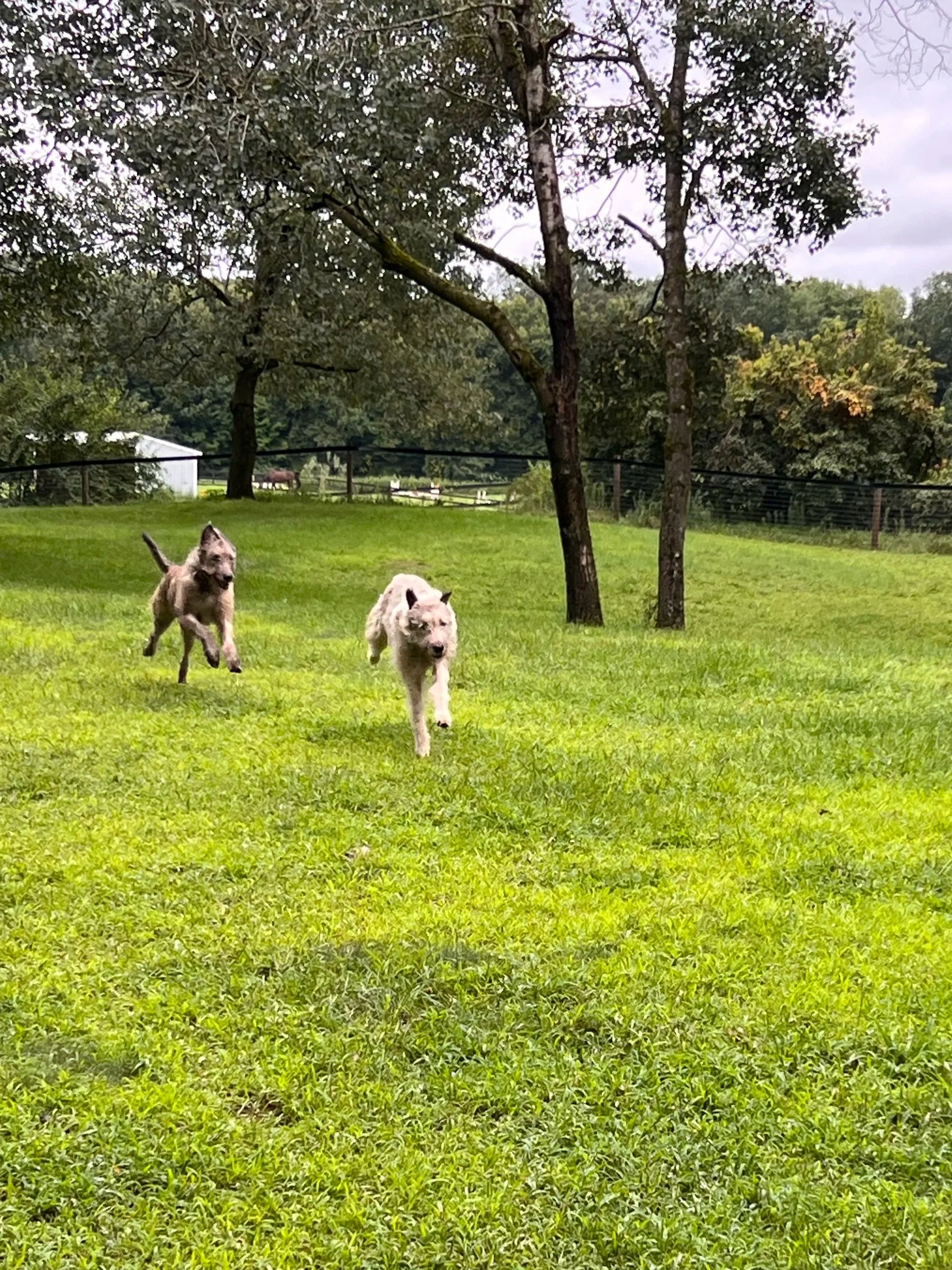 Puppy daycare works for many breeds, but not for Irish Wolfhounds. Wolfhound puppies are easily injured while roughhousing with other dogs. Injuries before their growth plates close can be severe and often need expensive orthopedic surgery by a board-certified specialist. So too, over-exercising an IW puppy can be Hazardous. This is NOT a breed for road working or marathon jogging.