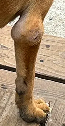 They are caused by repeated trauma or impact with the ground as the dog lies down on hard surfaces such as concrete kennel runs, ceramic tiles, or any unforgiving surface. Boom, the elbow hits first, and the giant dog shifts his weight, and the Ischial Tuberosity, or seat bone, located just slightly under the tail (which we refer to as the shelf), hits the floor too. The body's defenses are to rush fluid to the injured area as an inflammatory response and to protect the joint. These hygromas begin small, similar to a golf ball, and if there is repeated trauma on the area, the sac will grow larger and larger to the size of an orange.