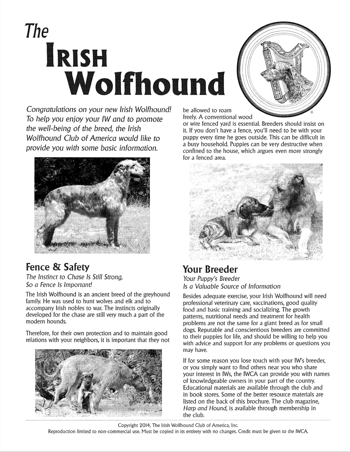 When obtaining an Irish Wolfhound puppy, I strongly urge you to do so cautiously and keep handy these invaluable tools during your search. These include the Irish Wolfhound Club of America (IWCA) "Puppy Buyers Guide" and "So You Want to Own an Irish Wolfhound" brochure. You should read through the accompanying codes of conduct. As longstanding members of the IWCA and, most importantly, as breed custodians, the IWCA Standard of Behavior for Breeders is very necessary, and I expect all breeders to adhere to it as well.